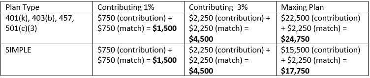 Let’s say we have an investor who is 45 years old and makes $75,000. This is what they would be able to get with a 3% matching contribution in a few different types of retirement plans: